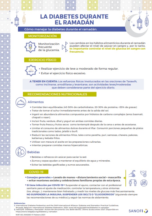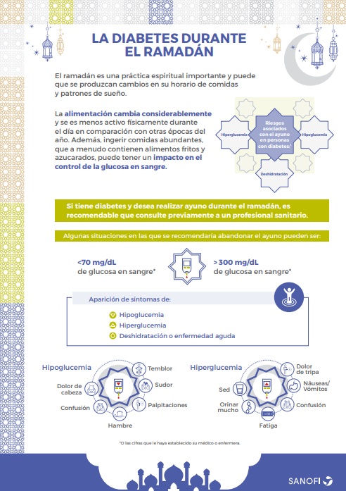 - Consejos a tener en cuenta si tiene diabetes y quiere hacer el Ramadán: Folleto informativo de Sanofi en español con recomendaciones y consejos prácticos para personas con diabetes que quieren hacer el Ramadán. Descargar aquí.